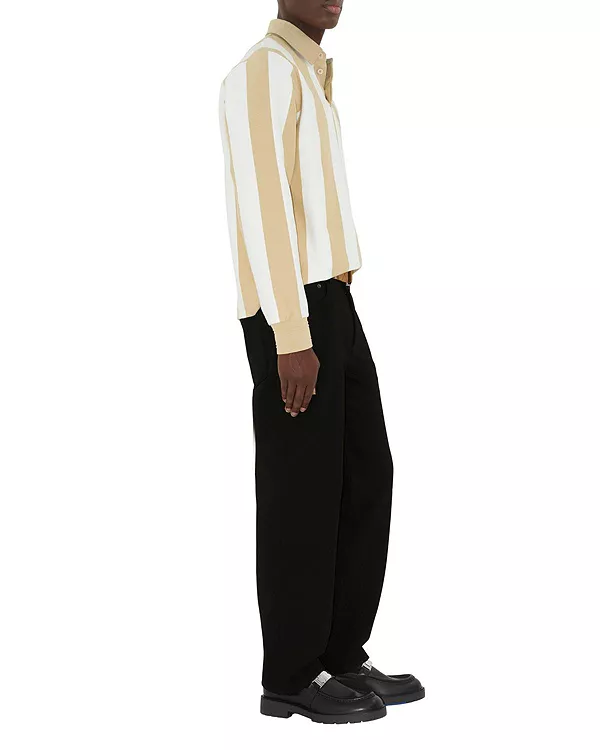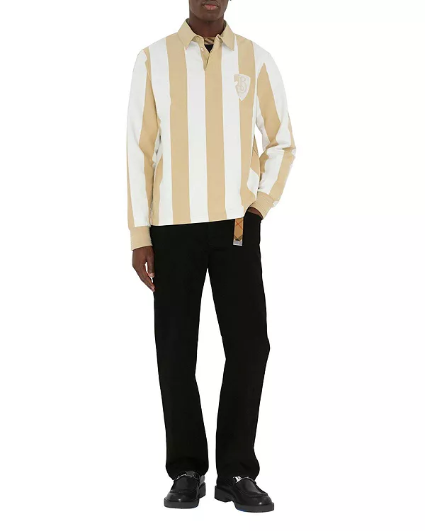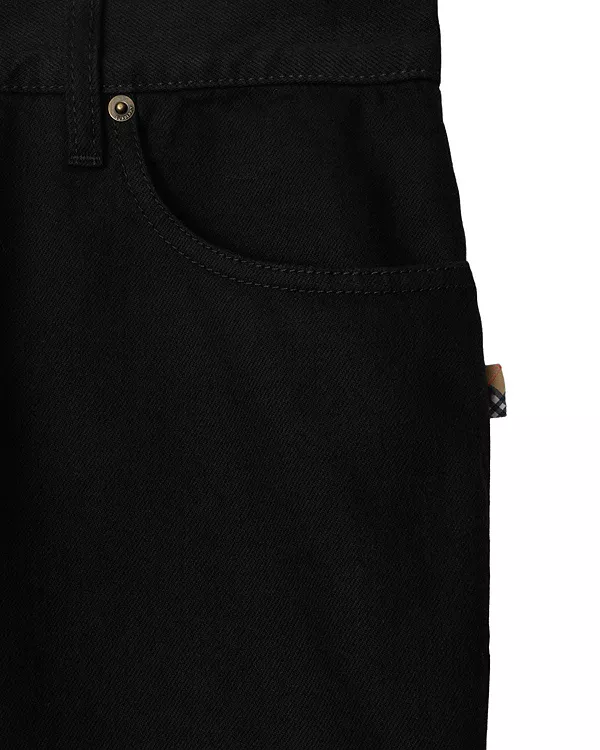 Джинсы, изготовленные в Италии из плотного денима, свободного кроя. Модель с пятью карманами украшена клетчатой нашивкой Burberry и замшевой нашивкой с тисненым изображением рыцаря-наездника.