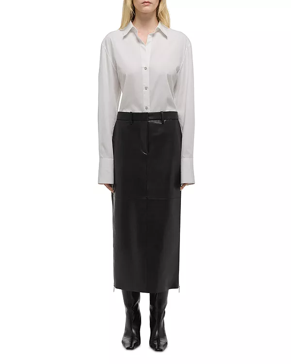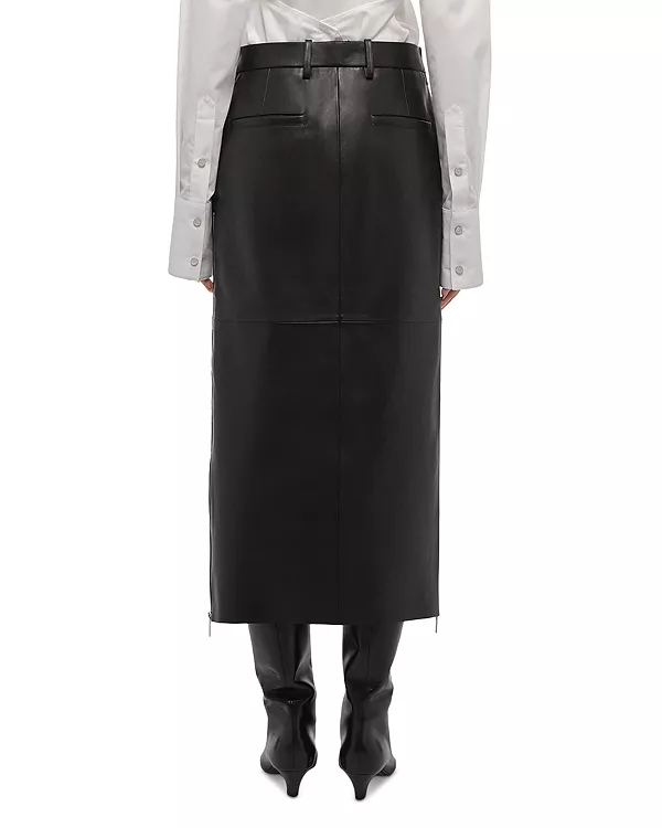 Юбка миди от Helmut Lang из трикотажной кожи с удлиненными металлическими молниями по бокам и классическими деталями брюк.