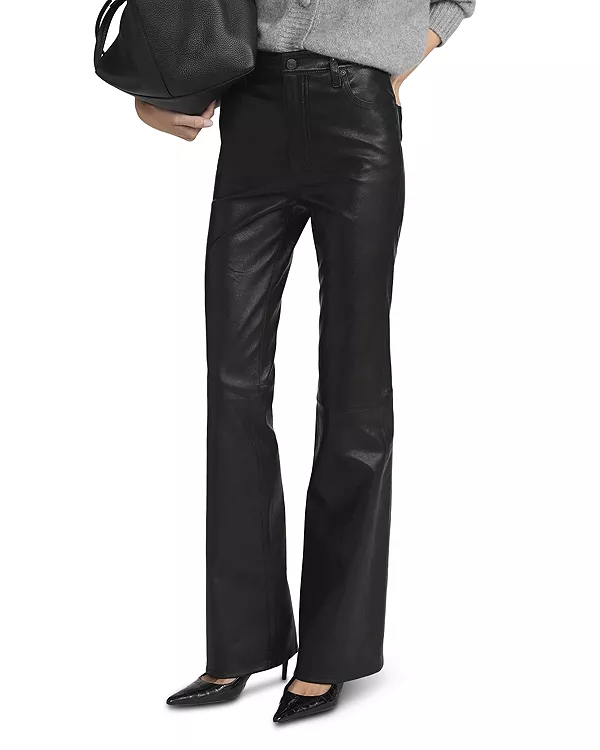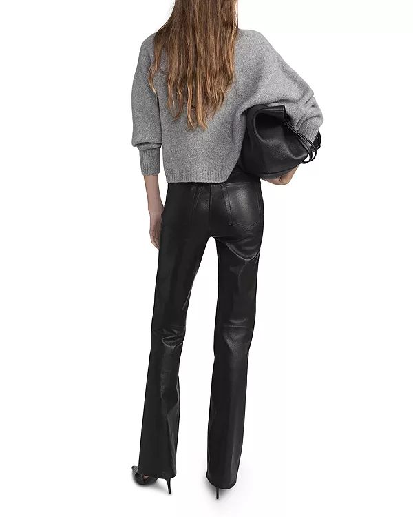 Модель Reboot от FRAMES, переосмысленная в чисто черной коже. Дизайн с высокой талией и длинными расклешенными штанинами.