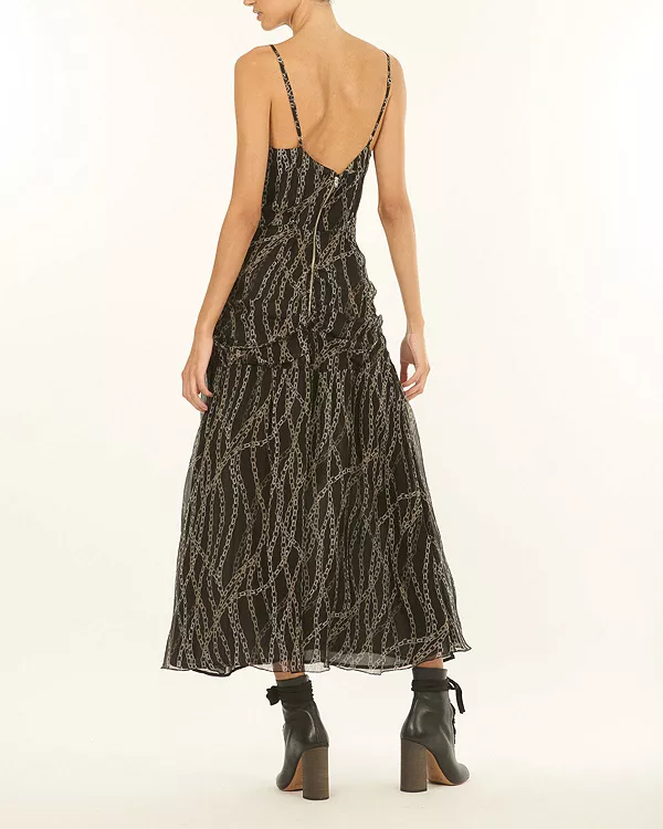 Макси-платье Mira, изготовленное из 100% органического шелкового шифона с принтом Black Chain, украшено каскадными оборками и цветочными аппликациями, которые добавляют текстуру и движение. Этот силуэт длиной до пола грациозно струится, излучая вневременную элегантность и очарование.