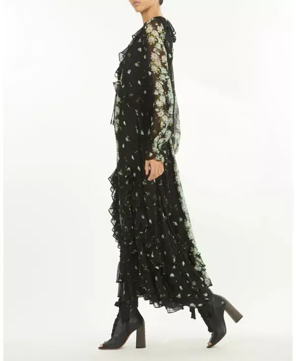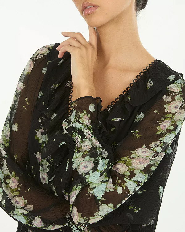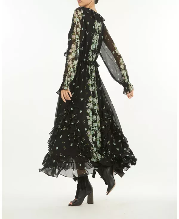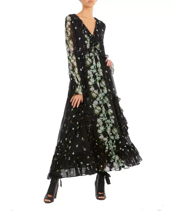 Платье Brighton, изготовленное из 100% органического шелкового жатого шифона, отличается мягкой текстурой и изящной драпировкой. Платье с черным цветочным принтом, нежными оборками, завязками на вырезе и струящимся подолом, это макси-платье с длинными рукавами излучает вневременную элегантность и романтику.