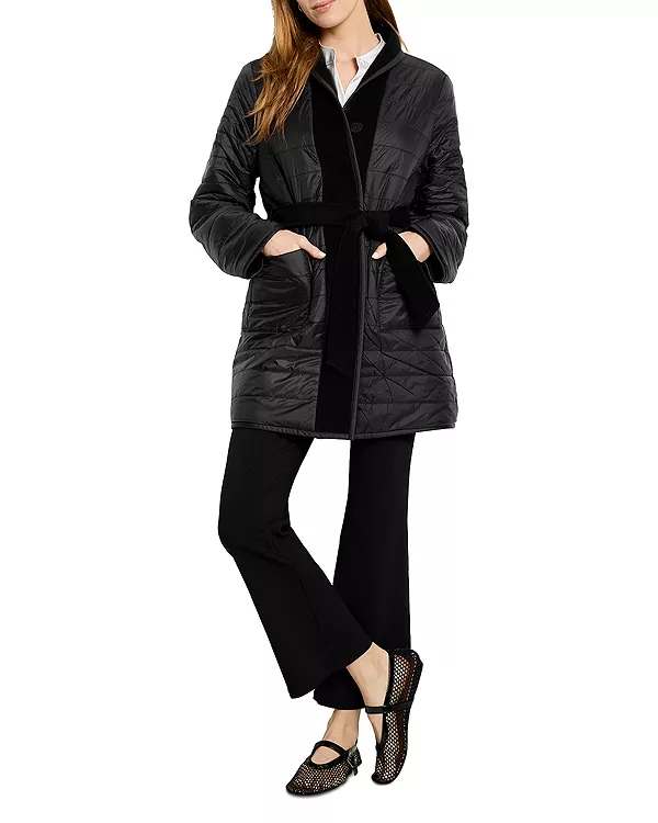 Особенности: Воротник-шаль Длинные рукава Застежка на кнопки спереди С одной стороны стеганая, с другой - шерстяная ткань Завязка на талии Прорезные карманы со стороны шерстяной ткани, накладные карманы со стеганой стороны Стеганая сторона ветрозащитная, водоотталкивающая и дышащая На подкладке Импортный товар