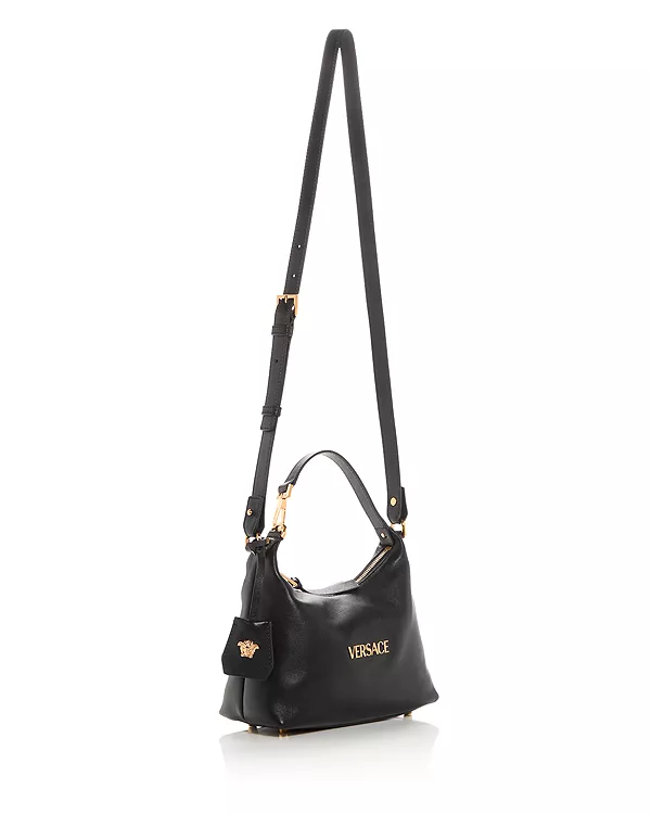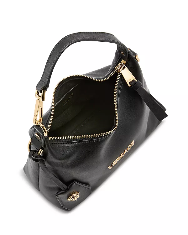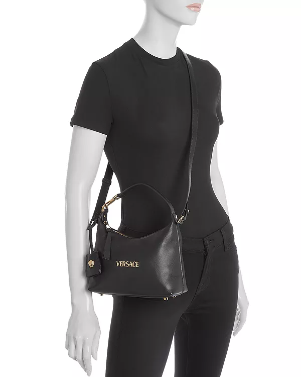 Сумка-хобо Versace Tag изготовлена из ультрамягкой кожи наппа. Этот универсальный аксессуар украшен металлической надписью Versace и легко носится в руке за верхнюю ручку или через плечо благодаря съемному и регулируемому кожаному ремешку. Съемный кожаный брелок с фурнитурой в виде Медузы завершает дизайн.