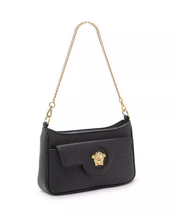 Мини-сумочка Versace La Medusa изготовлена из зернистой телячьей кожи и украшена фирменной трехмерной фурнитурой Дома. Этот компактный аксессуар можно носить через плечо в повседневном стиле или как элегантный клатч со съемным цепочным ремешком.