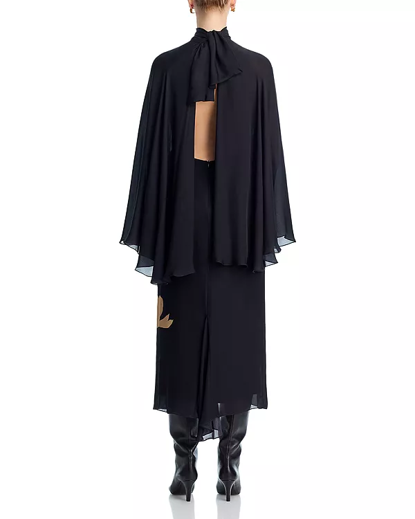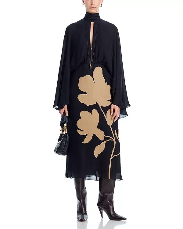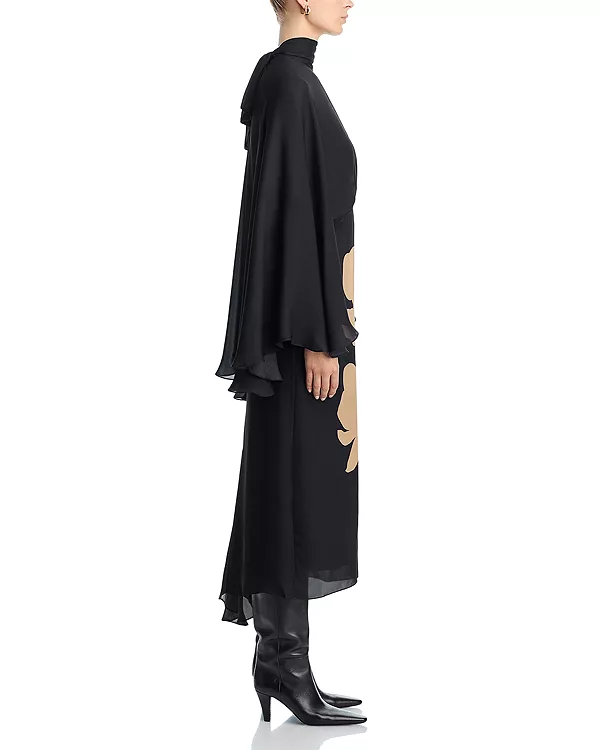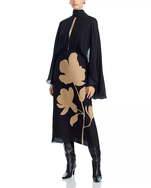 Это длинное платье от Johanna Ortiz выполнено из легкого шелка, имеет воротник-халтер и широкие расклешенные рукава. Крупный цветочный узор эффектно контрастирует с минималистичным силуэтом.
