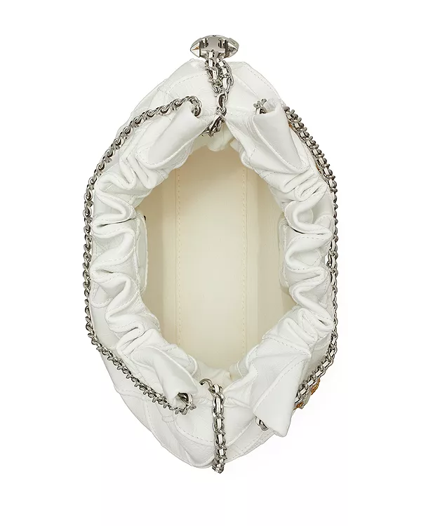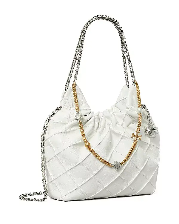 Мини-сумка Tory Burch Mini Fleming Hobo Bag, изготовленная из мягкой кожи, украшена складками в виде ромбов и цепочкой с кожаной шнуровкой.