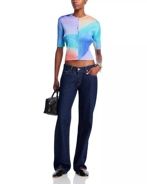 Этот кардиган на пуговицах с короткими рукавами украшен красочным градиентным принтом, вдохновленным ритмичными волнами.