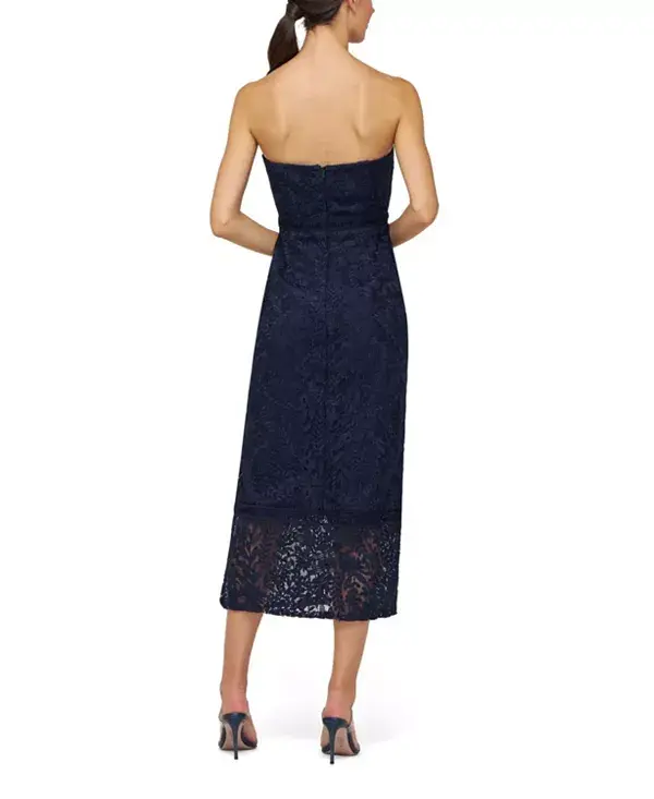 Особенности: Без бретелей Застежка-молния сзади Без рукавов Без карманов Без пояса Без пояса Полностью на подкладке Платье без бретелей длиной до колена, выполненное из кружева с розовым букетом, с отделкой по талии и подолу. Силуэт «футляр» с прозрачной кружевной вставкой и боковым разрезом. Импортное производство