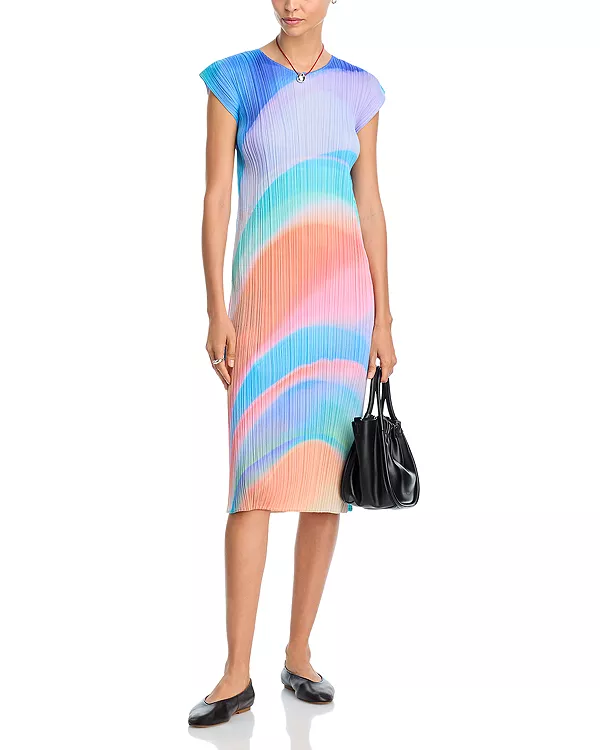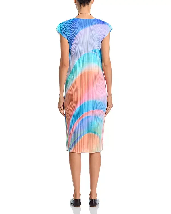 Это платье с круглым вырезом и французскими рукавами украшено красочным градиентным принтом, вдохновленным ритмичными волнами.