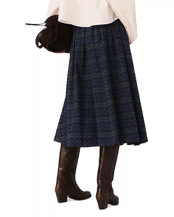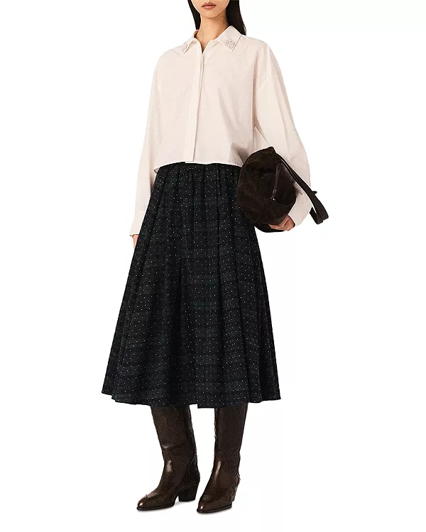 В этом сезоне Maje представляет оригинальные модели с прекрасным сочетанием текстур и объемов. Эта длинная юбка сочетает в себе классический клетчатый узор с блеском стразов. Пышная и расклешенная, она обеспечивает плавность движений и создает новый, четкий силуэт.