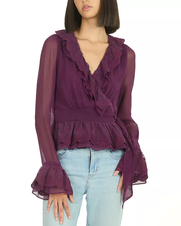 Романтическая блузка Poet, изготовленная из 100% органического шелкового жатого шифона, отличается легкой, струящейся драпировкой. Дизайн с оборками на вырезе, расклешенными манжетами и регулируемым запахом спереди создает силуэт в винтажном стиле, отличающийся утонченной элегантностью и очарованием.
