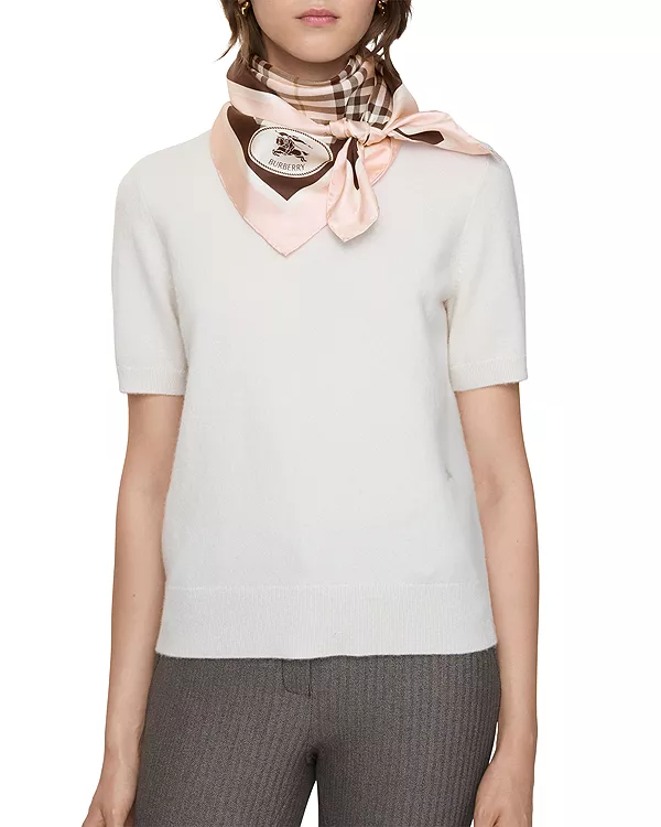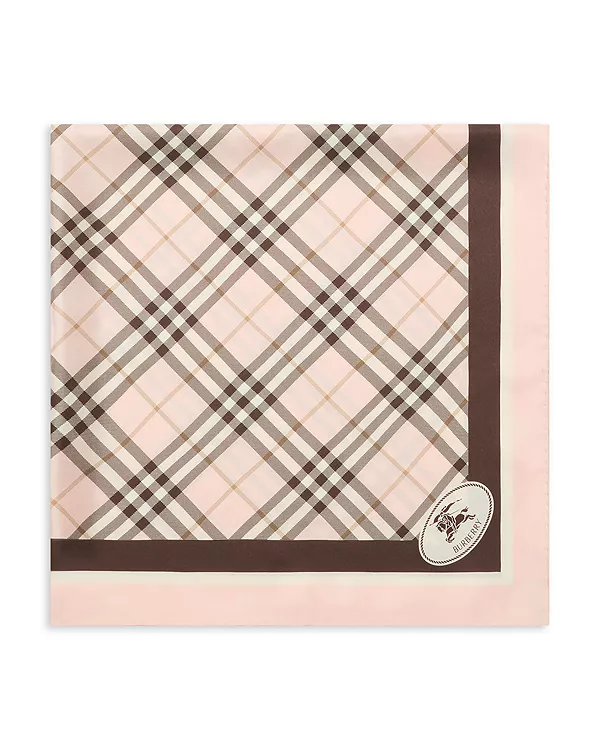 Квадратный шарф, изготовленный в Италии из шелковой саржи, с принтом в виде клетчатого узора Burberry. Дизайн обрамлен контрастными полосами и фирменным знаком Knight, архивным мотивом, впервые появившимся на сумках Burberry в 1980-х годах.