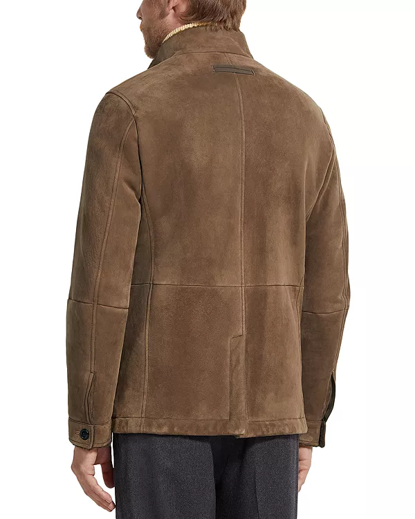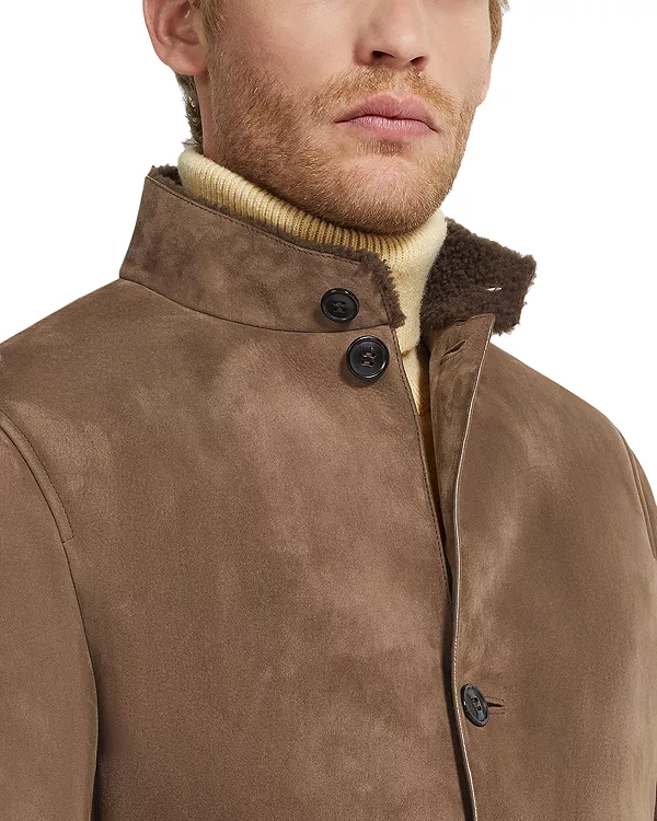 Мягкая овчина повторяет знакомые линии рабочей куртки Il Conte от ZEGNA, придавая уютный оттенок минималистичному силуэту с воротником-стойкой. Застежка на пуговицы и большие накладные карманы создают ощущение простой, но изысканной элегантности, а кожаные детали подчеркивают естественную цветовую гамму.