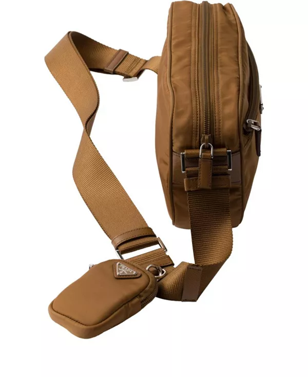 Бренд: Prada Цвет: коричневый Эта прямоугольная сумка, выполненная из инновационной ткани Re-Nylon со съемным карманом на молнии, отсылает к стилю стритвеар и культовым чертам Prada, включая фирменную треугольную фурнитуру как на сумке, так и на кармане.