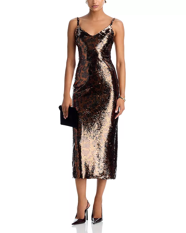 Платье L'AGENCE Noella, украшенное пайетками, переливается леопардовым принтом в тон и имеет струящуюся текстуру, придавая своему лаконичному силуэту нотку дикого гламура. Благодаря тонким бретелям и длине миди, это платье сделает ваше появление незабываемым.