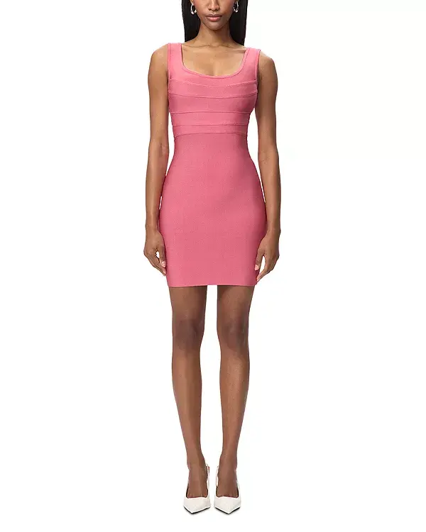 Платье Amara от Hervé Léger, представленное в образе № 11 из лукбука коллекции Resort '26, отличается облегающим силуэтом, плотным трикотажным кроем и деталями в виде бандажа на лифе. Платье мини-длины имеет вырез-лодочку и застегивается на потайную молнию по центру спины.