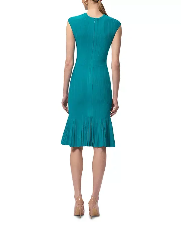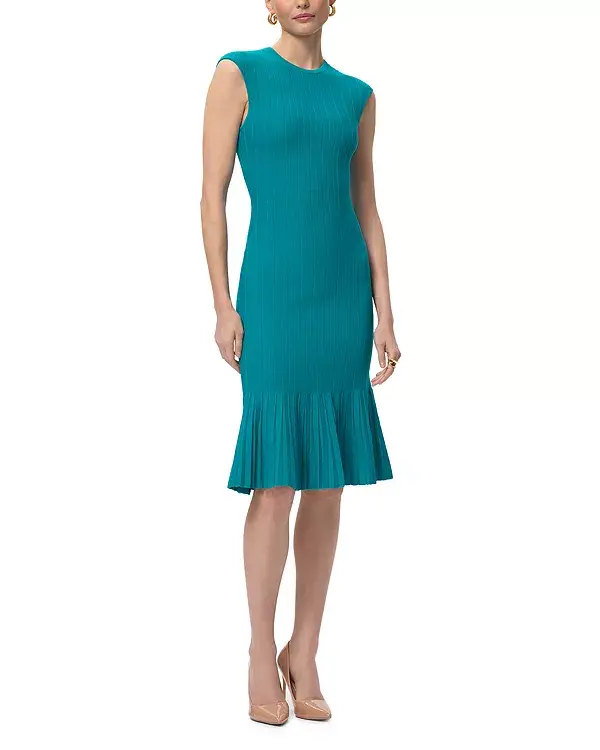 Платье Bridget - модель средней длины, сшитая из вискозного трикотажа. Оно имеет короткие рукава, слегка плиссированный лиф и плиссированный расклешенный подол, а также застежку-молнию по центру спины.