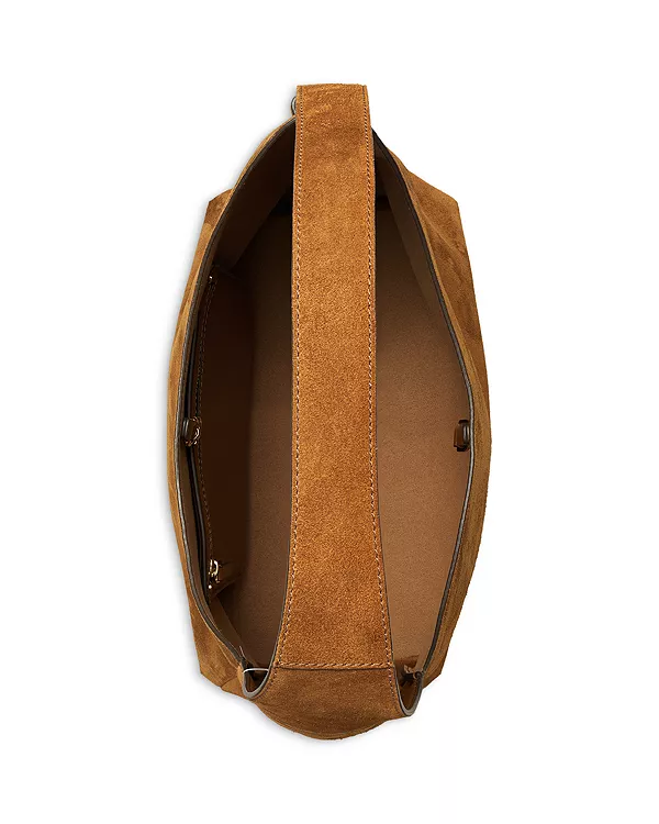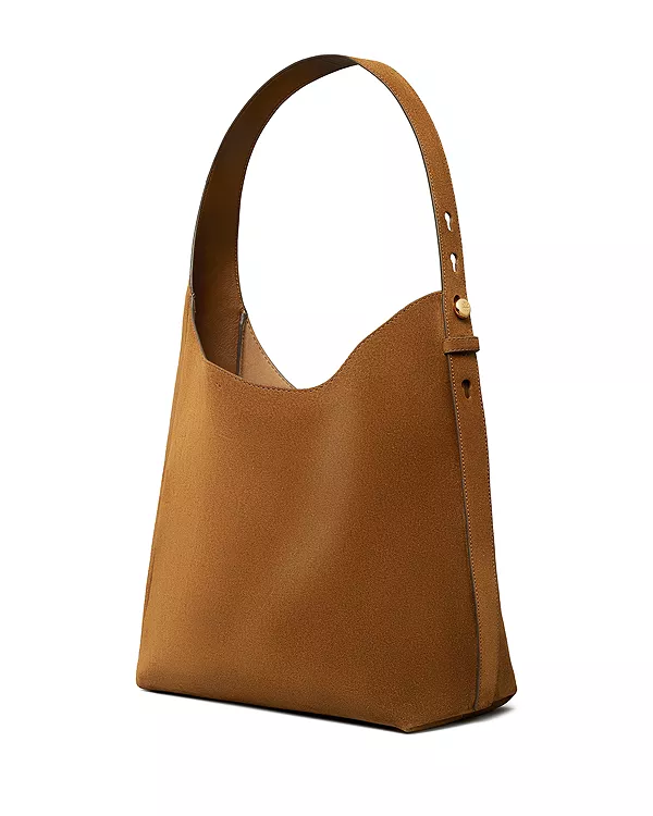 Сумка-хобо Romy выполнена из мягкой замши и имеет слегка асимметричный силуэт. Легкая, с просторным внутренним отделением, организованным с помощью глубокого кармана на молнии, она вмещает телефон, кошелек, блокнот, бутылку с водой, ноутбук и ключи. Сумка оснащена тонким плечевым ремнем и новым логотипом Tory Burch в виде пуговицы.