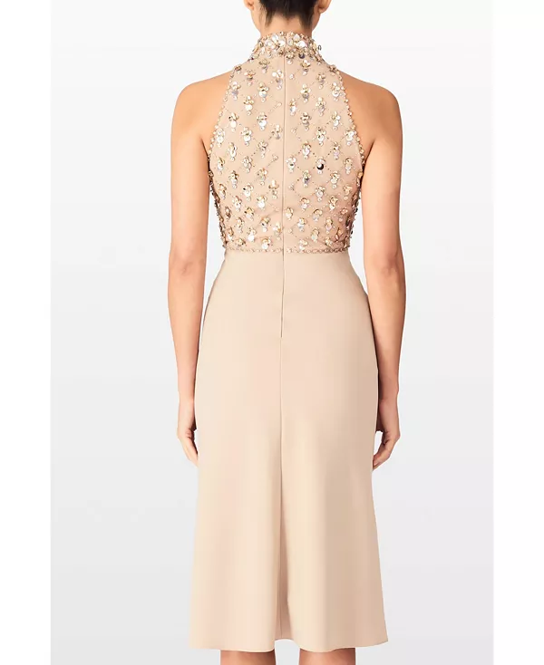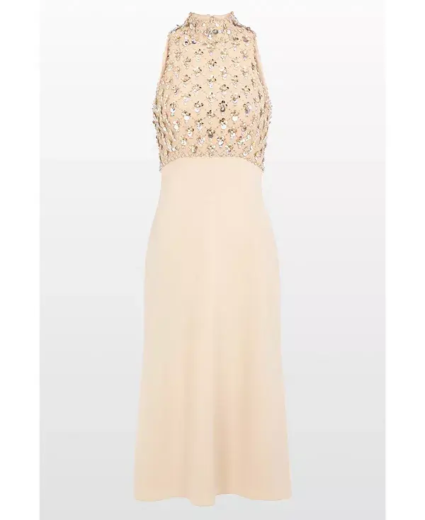 Бренд: Jenny Packham Цвет: бежевый Этот фасон с высоким воротником сочетает в себе структурированность и сдержанную отделку, создавая образ, который ненавязчиво привлекает внимание. Лиф выполнен из прозрачного тюля и вышит бисером в тон в виде графического цветочного мотива, придавая текстуру и объем, сохраняя при этом чистый, современный силуэт. Приталенный силуэт плавно переходит в мягко расклешенную юбку, обеспечивая свободу движений и элегантный вид. Изысканное, универсальное платье, созданное для того, чтобы органично вписываться как в вечерние мероприятия, так и в торжественные случаи.