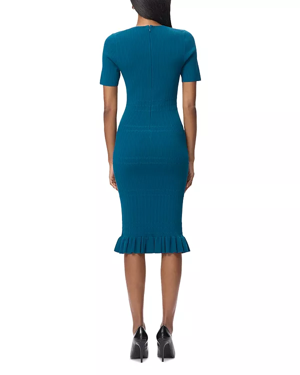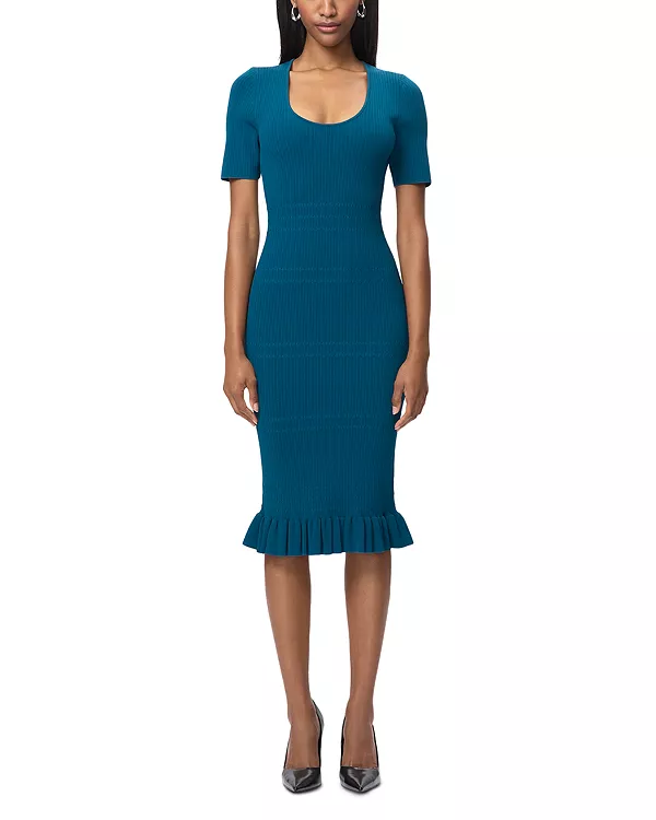 Платье Cosette от Hervé Léger, новинка коллекции Resort '26, выполнено из трикотажа средней плотности и имеет удобный, практичный силуэт. Это универсальное повседневное платье миди с вырезом-лодочкой, короткими рукавами и оборками по низу.