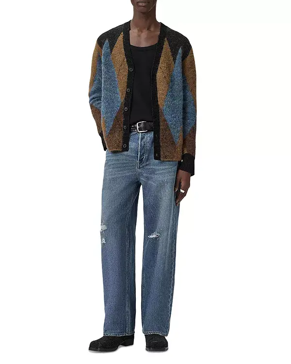 Особенности: V-образный вырез Застежка на пуговицы спереди Длинные рукава Волистная текстура для создания эффекта ворса Жаккардовый узор «аргайл» по всей поверхности Импортный товар
