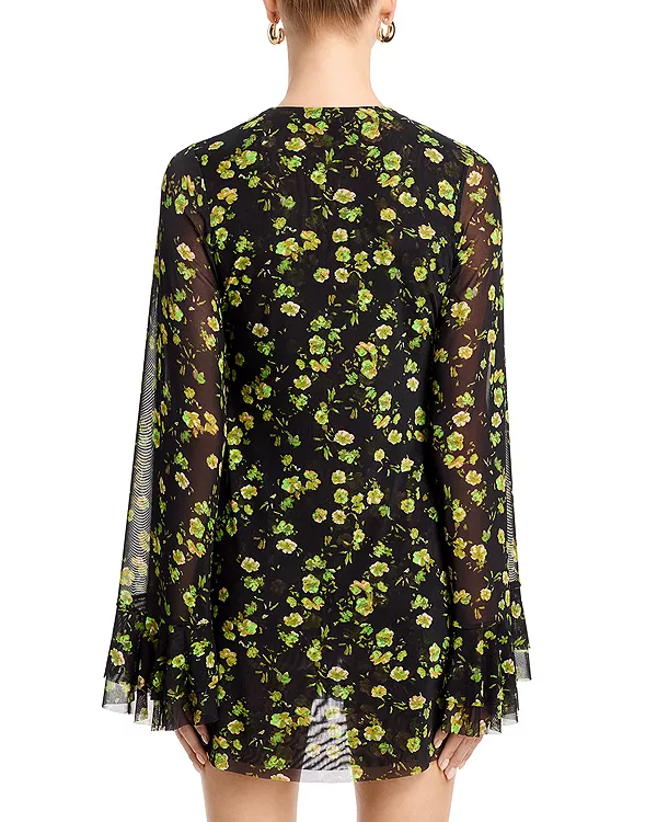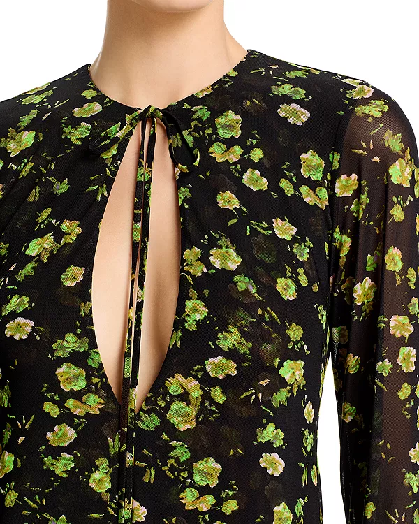 Цветочный принт по всей поверхности, вырез и завязка на передней части лифа