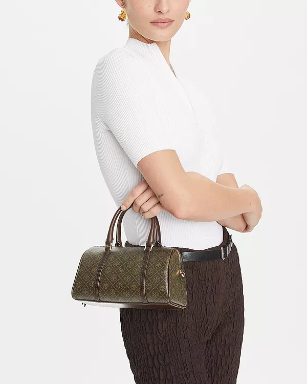 Сумка-бочонок, украшенная фирменным жаккардовым узором Tory Burch, имеет изящные пропорции и характерную форму, восходящую к временам мореплавателей XVI века. Современный кожаный каркас и прошитые верхние ручки с пряжками подчеркивают мастерство исполнения, сохраняя форму и структуру сумки. Носите ее со съемным плечевым ремнем или без него.