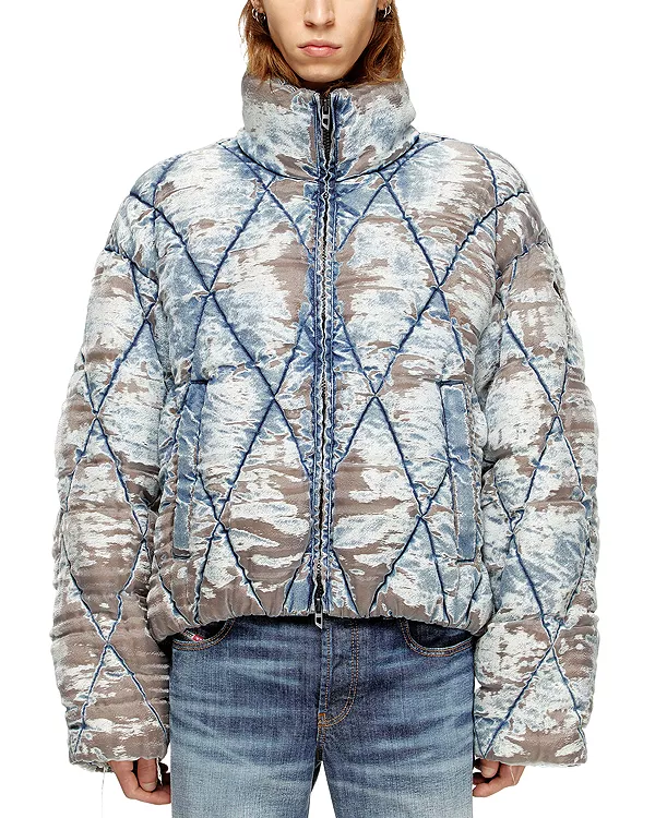 Эта зимняя куртка от Diesel изготовлена из джинсовой ткани с ромбовидной стежкой и эффектом потертости; такая обработка создает прозрачные участки, обнажая цветной утеплитель. Массивный воротник, а также манжеты и нижний край с регулируемым шнурком помогают сохранять тепло.