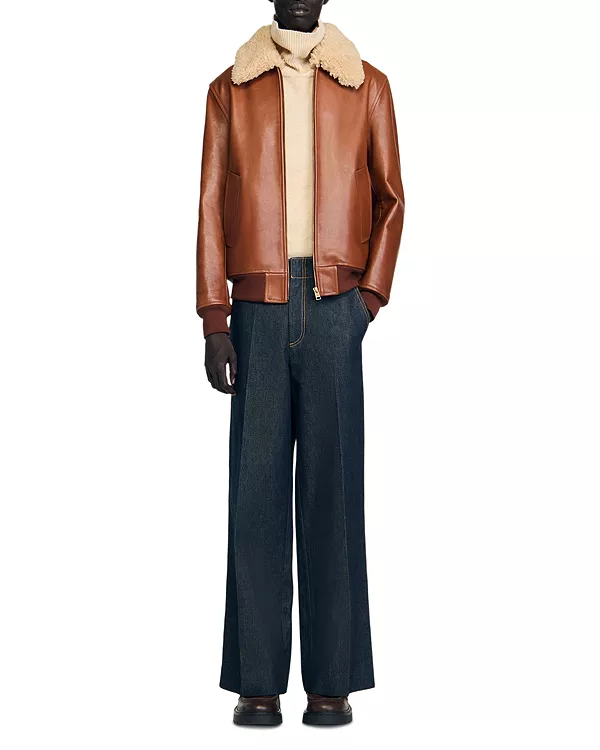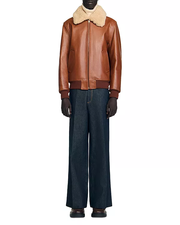 Кожаная куртка с воротником из овчины, застежкой на молнию и карманами с кантом.