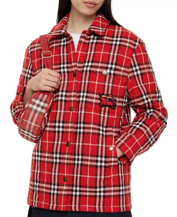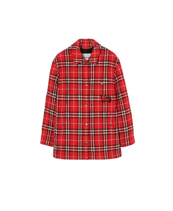 Бренд: Burberry Цвет: красный Рубашка-куртка из мягкой шерстяной фланели, сотканная с клетчатым узором Burberry в сезонном красном цвете, создана в рамках нашей капсульной коллекции «Год Лошади». Модель имеет свободный крой и стеганую подкладку. На кармане вышит аппликацией наш дизайн «Всадник-рыцарь» с использованием текстурных и металлизированных нитей.