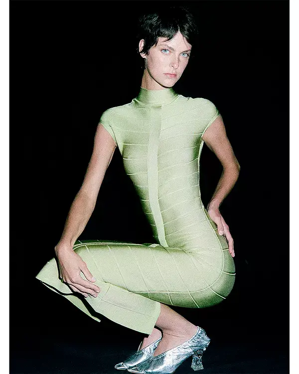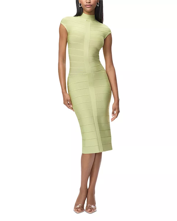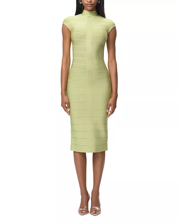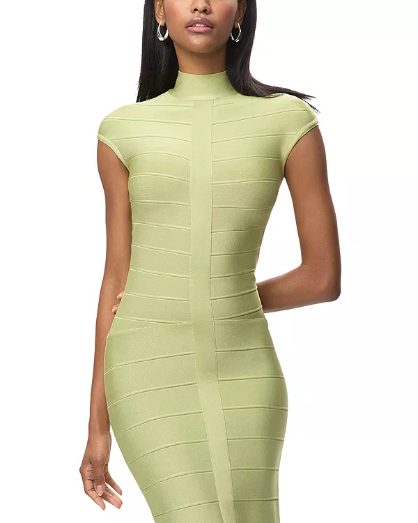 Бренд: Hervé Léger Цвет: зеленый Как видно на примере 8 из лукбука коллекции Resort '26, платье Davina от Hervé Léger имеет миди-крой и выполнено из бандажного трикотажа, призванного сглаживать и подчеркивать фигуру. Платье отличается высоким воротником, короткими рукавами и шевронным узором из настоящего бандажного трикотажа на лифе. Завершают образ бандажные акценты, разрез сзади и застежка-молния по центру спины.