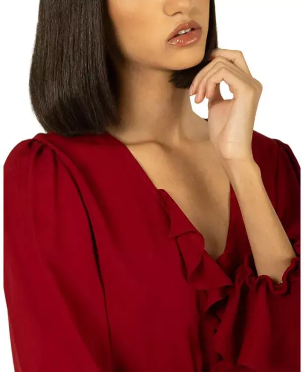 V-образный вырез с нежной оборкой и функциональными пуговицами