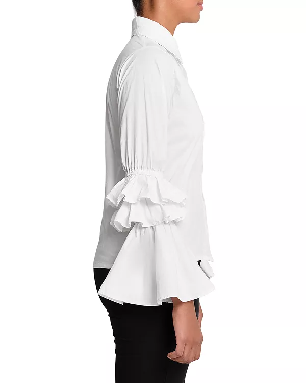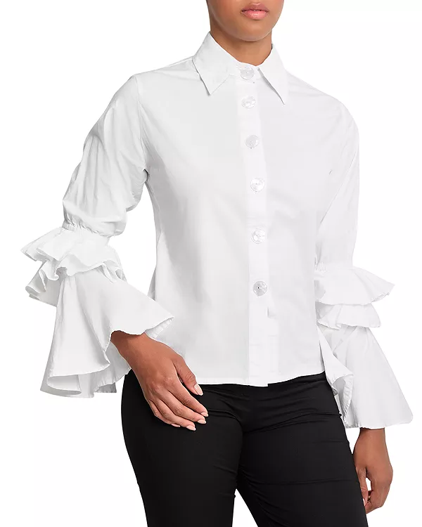 Длинные рукава, зауженные у локтей, с многослойными оборками и манжетами-колоколами