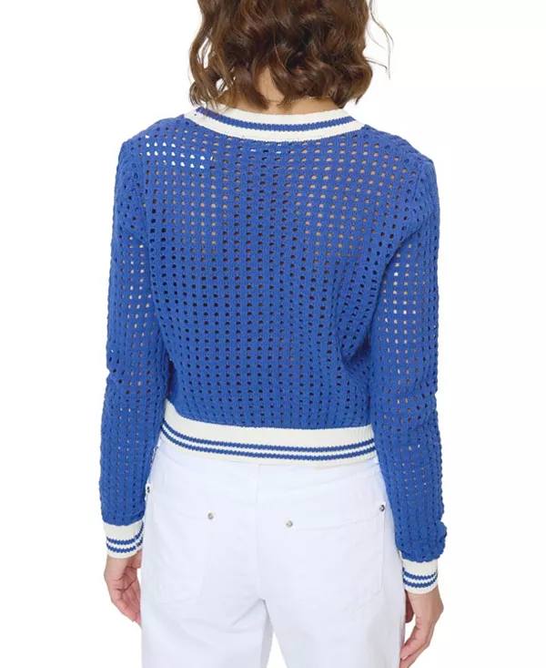 Бренд: Central Park West Цвет: синий В кардигане Junie Varsity Mesh Stitch сочетаются спортивный стиль и шик - легкая вещь, которая выделяется своим дизайном. Кардиган с открытой сетчатой вязкой обеспечивает комфорт и свежесть, привнося ощущение воздухопроницаемости в повседневный гардероб. Детали в стиле университетской формы добавляют игривости и современности, а свободный крой и ребристая отделка делают образ безупречно элегантным. Изготовленный из мягкой хлопковой смеси, Junie идеально подходит для того, чтобы накинуть его поверх топов, футболок или платьев для создания непринужденного, но изысканного образа.