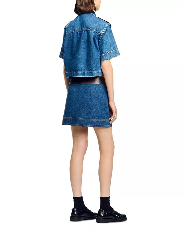 Мини-Юбка из джинсовой ткани с кожаной отделкой Sandro, синий