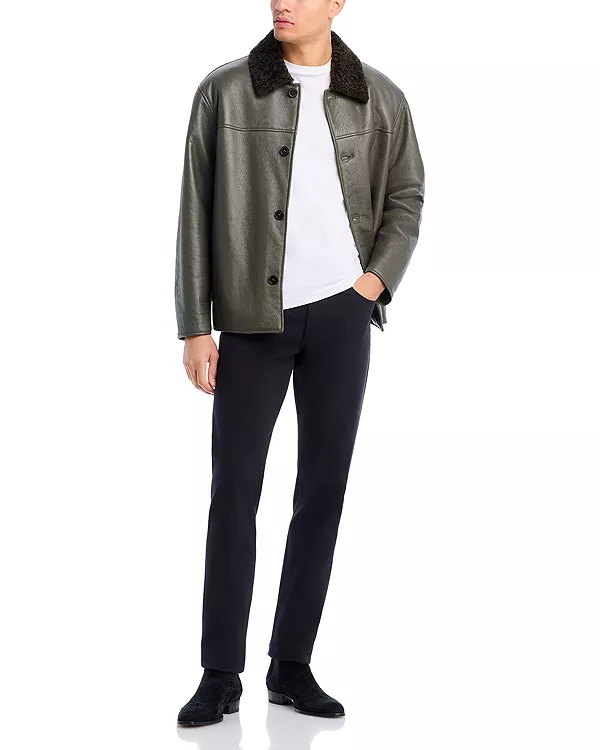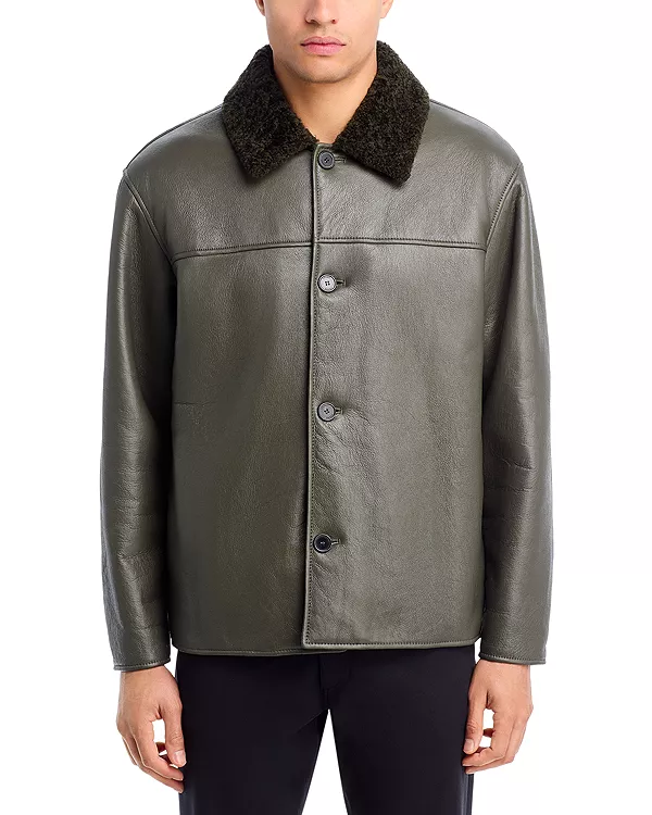 Структурированный жакет на пуговицах, изготовленный из мягкой матовой овчины. Модель с контрастным воротником из овчины, аккуратными швами и слегка свободным силуэтом для удобного многослойного образа.