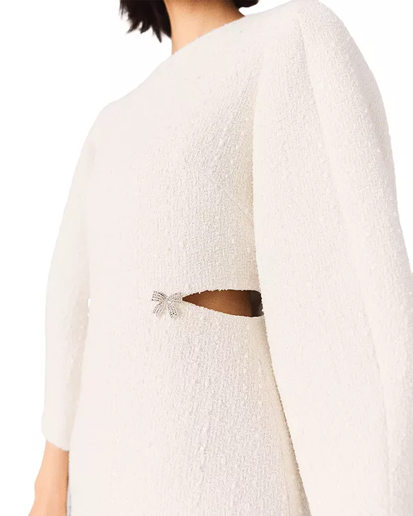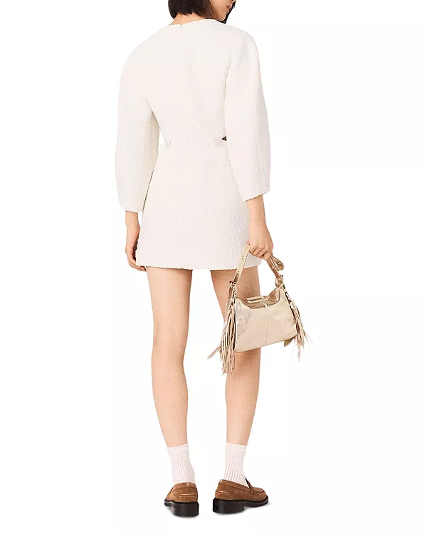 Мини-платье Maje из ткани с эффектом твида очаровывает своим уверенным силуэтом в стиле «бэбидолл». Боковые вырезы, украшенные сверкающими бантиками, и объемные рукава-фонарики придают силуэту современный вид.