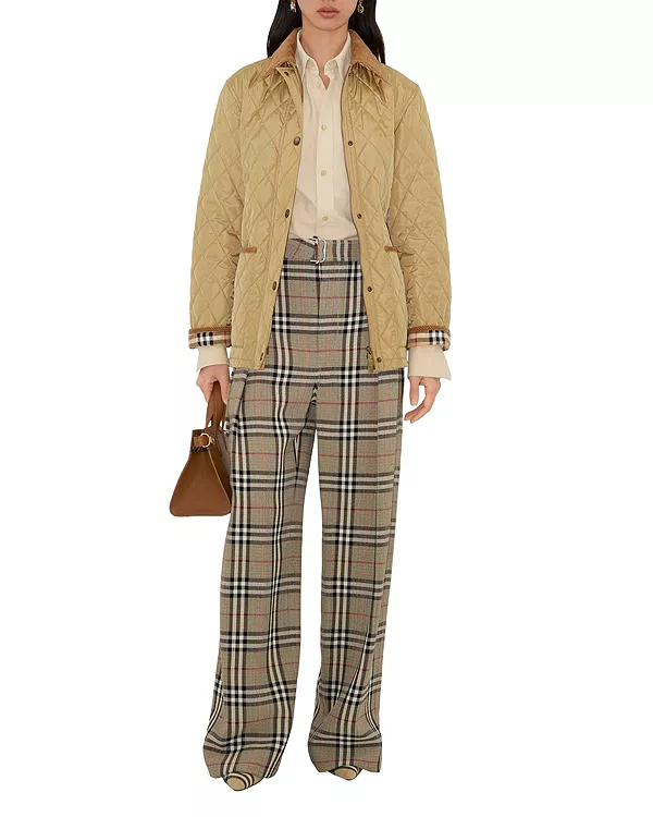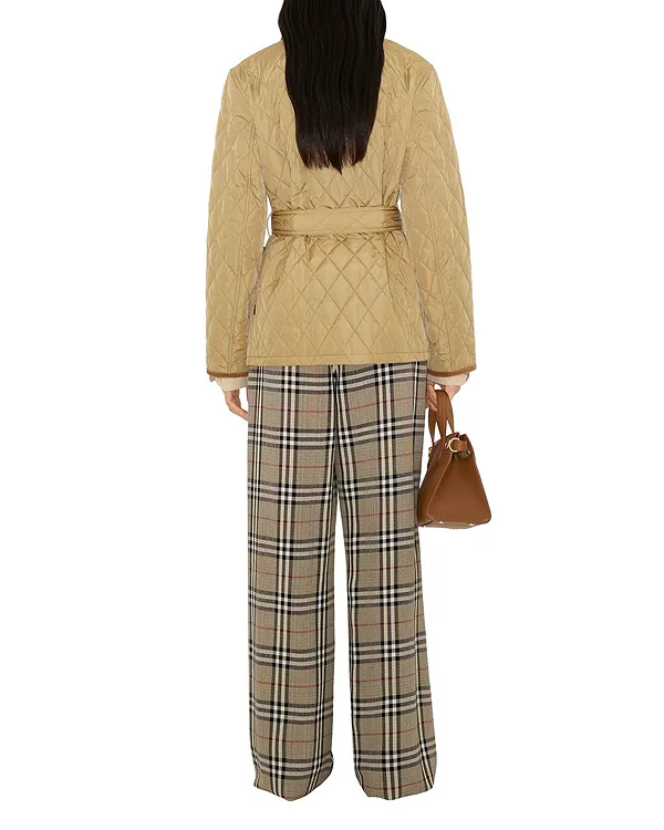 Бренд: Burberry Цвет: бежевый Стеганая куртка из легкого нейлона с контрастной подкладкой из хлопкового твила в клетку Burberry. Модель прямого кроя, с отделкой из вельвета в тон и поясом для подчеркивания талии.