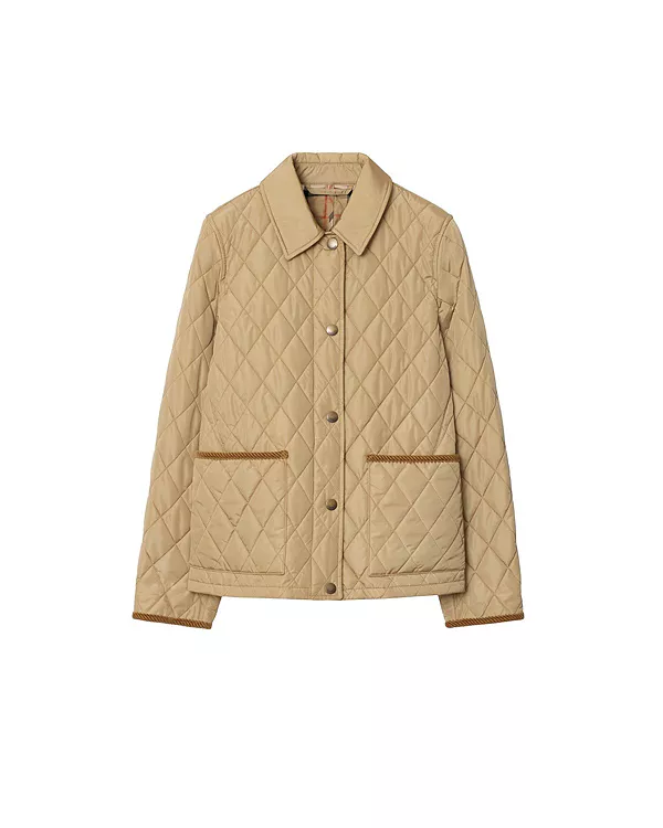 Стеганая куртка из легкого нейлона с подкладкой из хлопкового твила Burberry Check в фирменном песочно-бежевом цвете. Модель имеет приталенный крой и отделку из вельвета в тон.