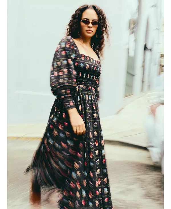 Приталенный силуэт в области груди, расширяющийся к талии и бедрам; длина до щиколотки
