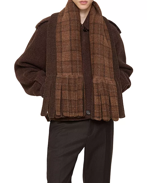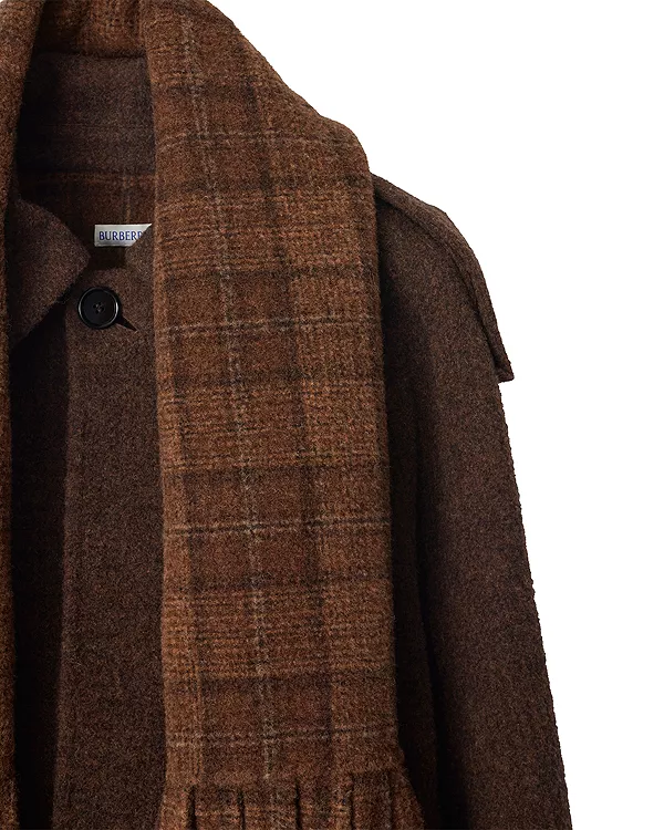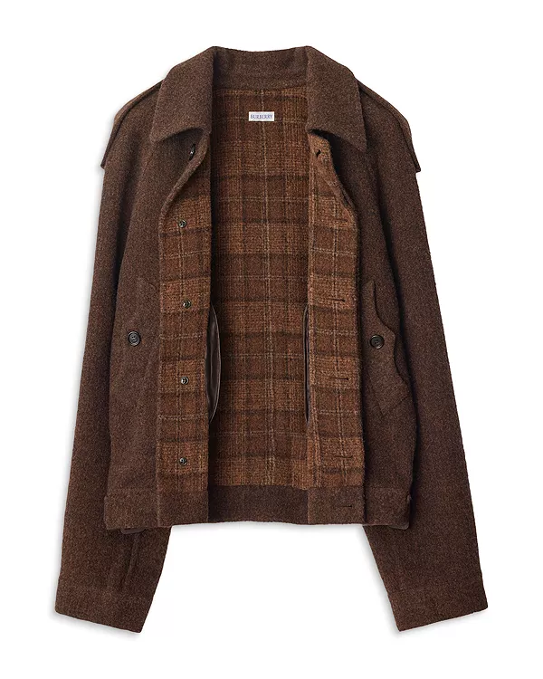 Эта куртка, изготовленная в Италии из двухсторонней смеси шерсти ламы и меха, дебютировала на показе зимней коллекции Burberry 2025 года. Она украшена погонами, вдохновленными фирменной верхней одеждой бренда, и съемным клетчатым шарфом с крупной бахромой. Куртка имеет стандартный крой и боковые ремни с пряжками для регулировки силуэта.