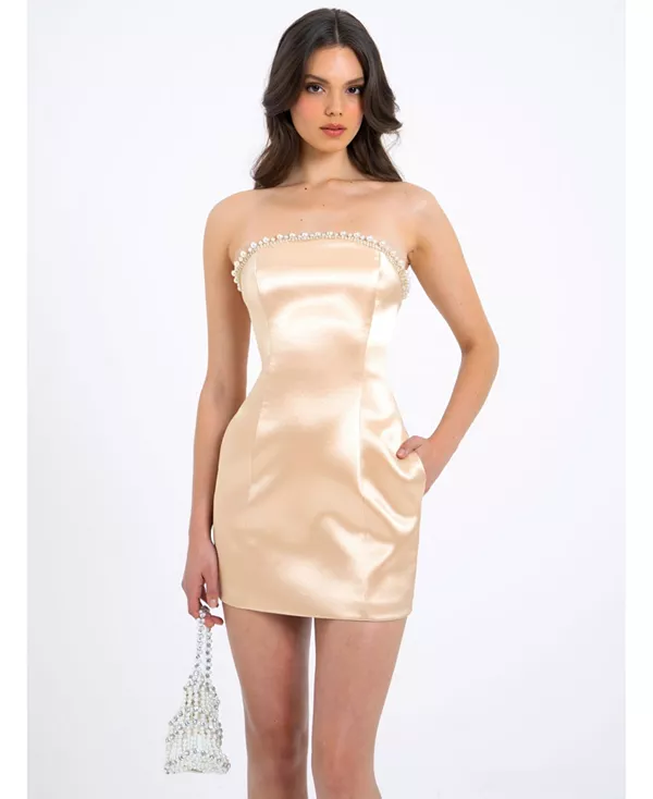 Особенности: Прямой вырез без бретелей, отделанный нежными жемчужными бусинами. Чистый, минималистичный силуэт подчеркивает плечи и декольте, добавляя изысканный, женственный штрих. Застежка-молния Структурированный лиф с внутренними косточками для надежной поддержки без бретелей. Гладкая атласная ткань полностью на подкладке для комфорта и сохранения формы, отделана потайной молнией сзади. Полностью на подкладке Импортный товар