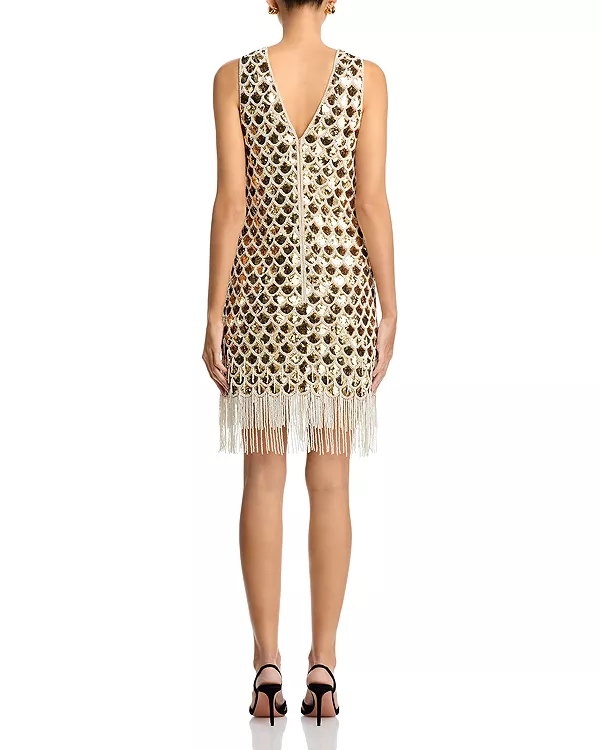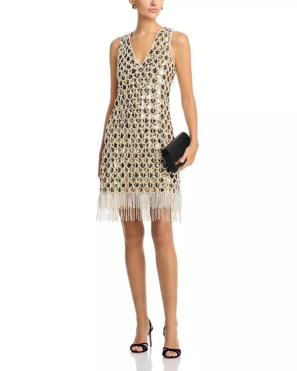 Украшение пайетками по всей поверхности, отделка бисером из искусственного жемчуга и бахрома по низу