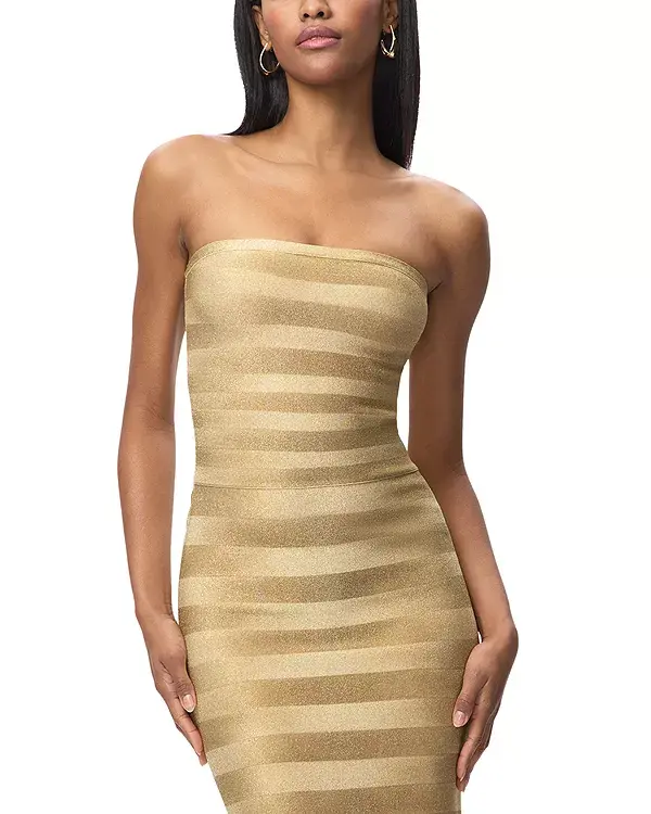 Платье Nia от Hervé Léger, представленное в пятом образе лукбука коллекции Resort '26, имеет прямой силуэт без бретелей и выполнено из плотного трикотажа, облегающего фигуру. Длина до щиколотки, градиентный эффект, разрез сзади и застежка-молния по центру спины.