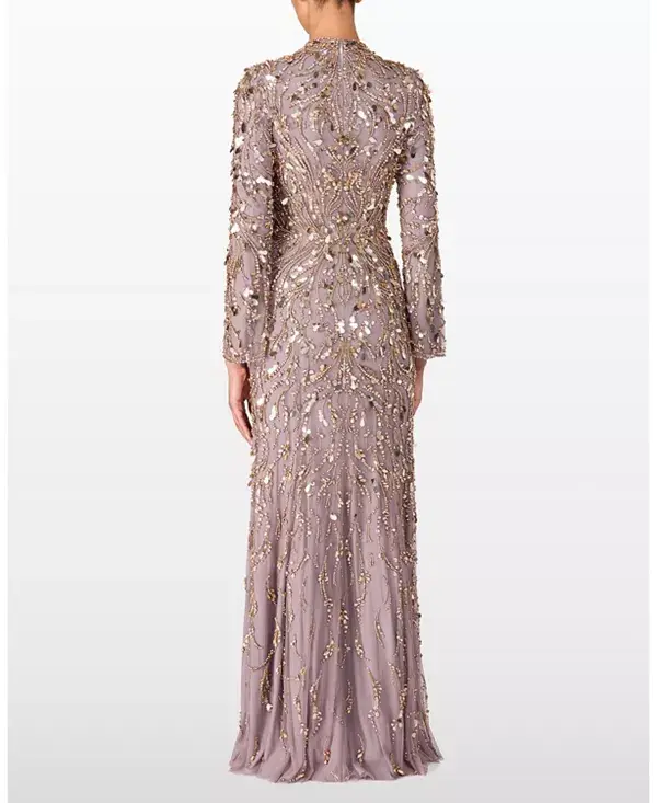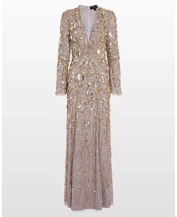 Бренд: Jenny Packham Цвет: серый В этом платье миндального оттенка вы сможете излучать вневременной гламур. Изысканное творение украшено мерцающей вышивкой бисером и пайетками, образующими замысловатые узоры. Глубокий V-образный вырез и затянутая талия создают невероятно привлекательный силуэт, подчеркивая фигуру с изяществом и точностью. Длинные рукава добавляют элегантности и утонченности, усиливая изысканность платья. Нежная отделка изящно отражает свет, гарантируя захватывающее дух появление на любом мероприятии.