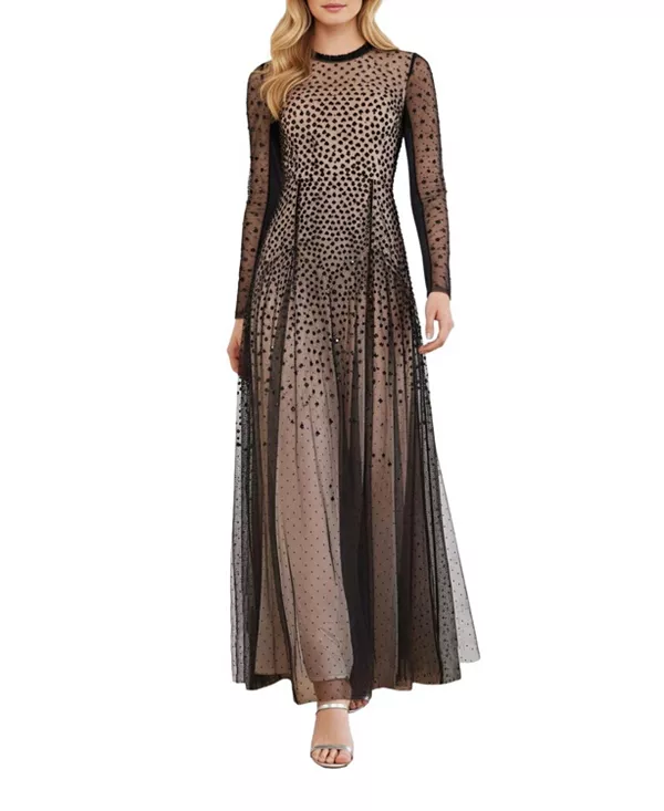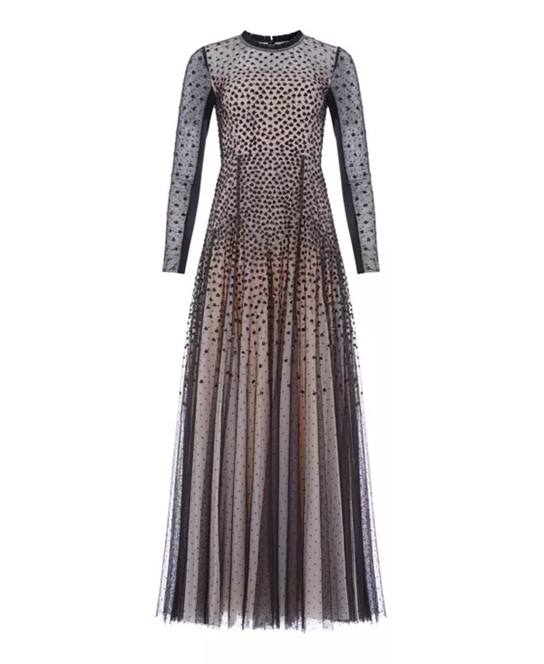 Приталенный крой в области груди и талии, свободный в области бедер; длина до пола.