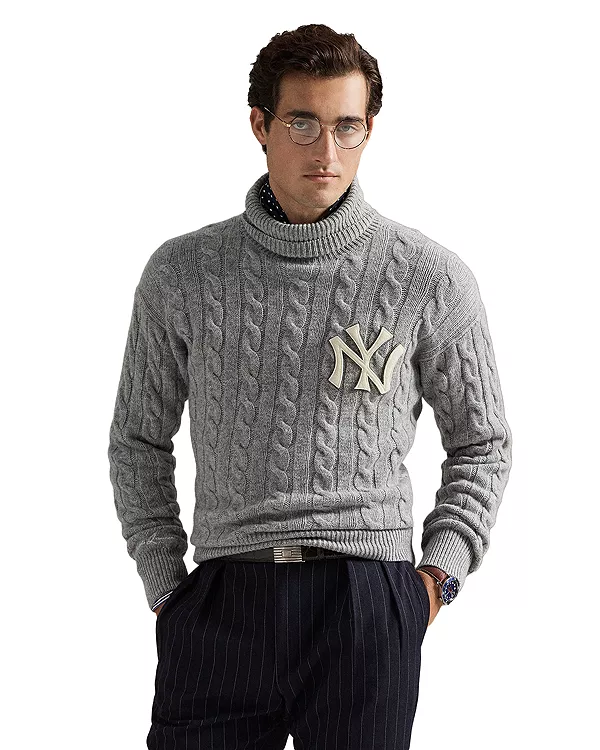 В детстве, живя в Бронксе, мистер Лорен обожал ходить на стадион «Янки», чтобы посмотреть, как играют его земляки. Этот свитер унисекс с высоким воротником посвящен давней любви мистера Лорена к команде «Бронкс Бомберс» и бейсболу, и украшен нашивкой с логотипом «Нью-Йорк Янкиз» из фетра. Выполненный в фирменном узоре «косичка», он сшит из мягкой шерстяной пряжи и украшен вышивкой «Ralph Lauren».