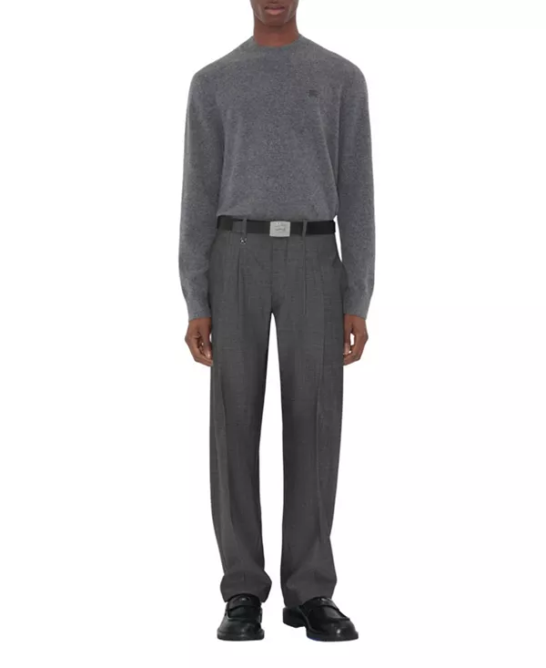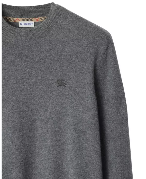 Свитер из легкой кашемировой ткани, украшенный вышитым в тон узором «Рыцарь-наездник». Модель с круглым вырезом имеет приталенный крой и изящную отделку в клетку Burberry внутри выреза горловины.