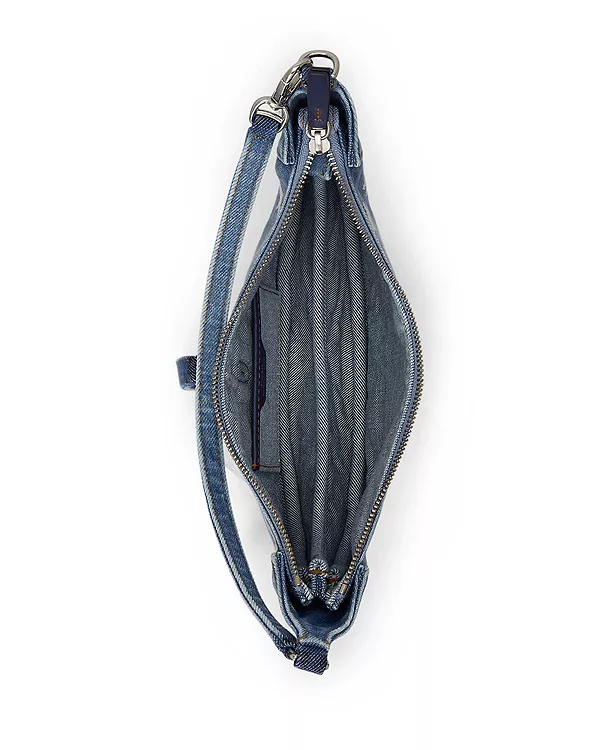 Регулируемая поворотная застежка крепится к двум металлическим D-образным кольцам, создавая силуэт клатча в форме круассана