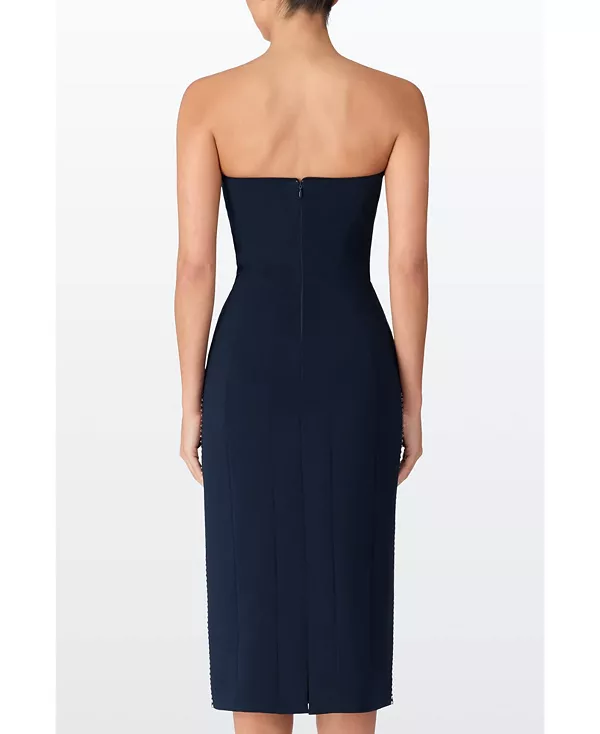 Бренд: Jenny Packham Цвет: синий Элегантное миди-платье без бретелей, облегающее фигуру и украшенное смелыми вертикальными линиями сверкающих элементов. Структурированный крой и эффектный узор создают изысканный, но современный образ. Идеально подходит для элегантных дневных мероприятий и коктейльных вечеринок, сочетая вневременной гламур с современным стилем.